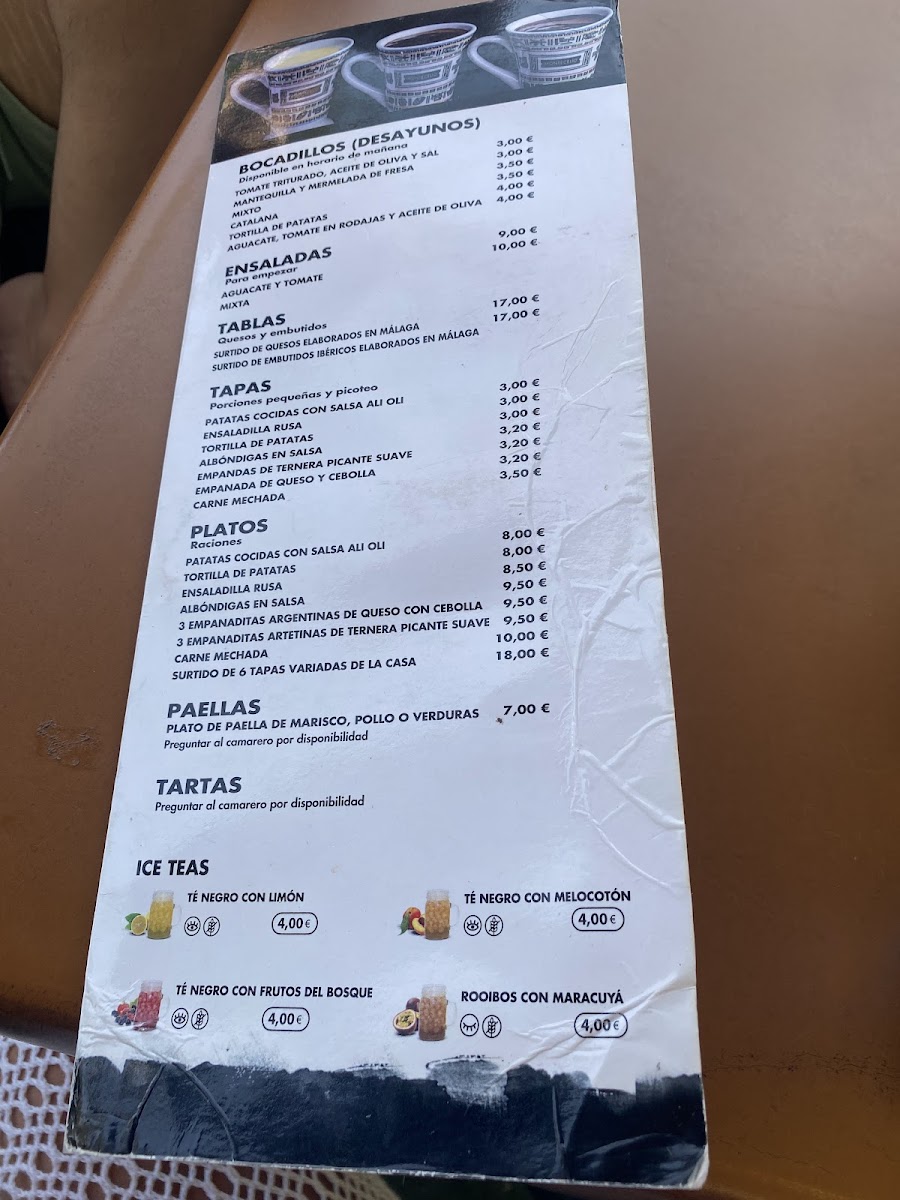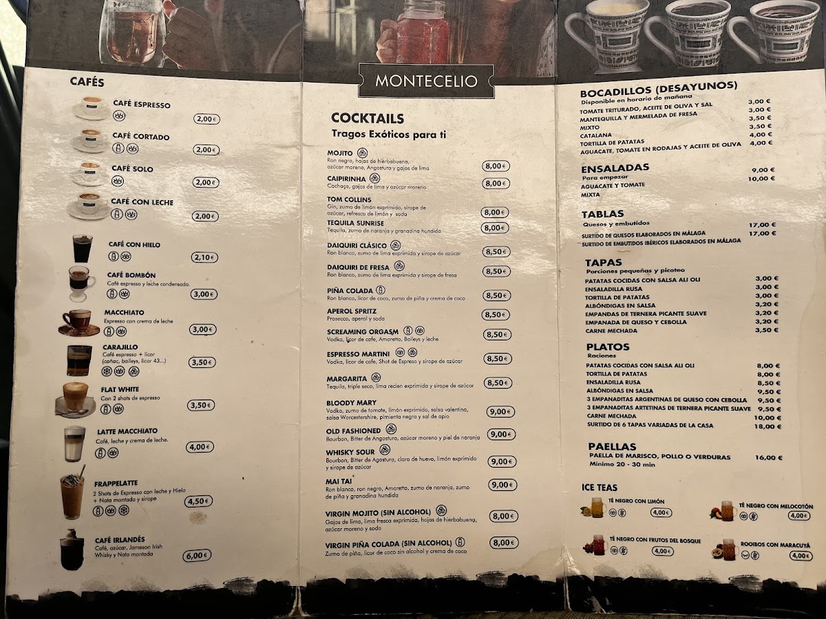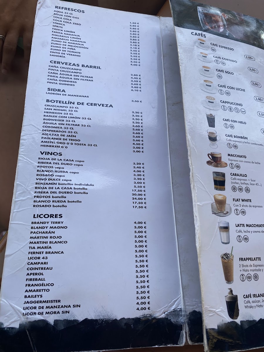 The menu offers a variety of options spanning several categories suitable for different times of the day and dining preferences. Guests can find a selection of cocktails, including classic choices like Piña Colada and Espresso Martini, alongside a range of beers and wines such as white wine and rosé. The food menu primarily features tapas and light bites, including traditional items like ensaladilla rusa, champignon, meatballs, and olives. These selections are complemented by accompanying baskets of bread, aligning with typical Spanish tapas service.