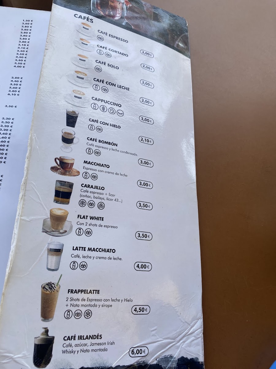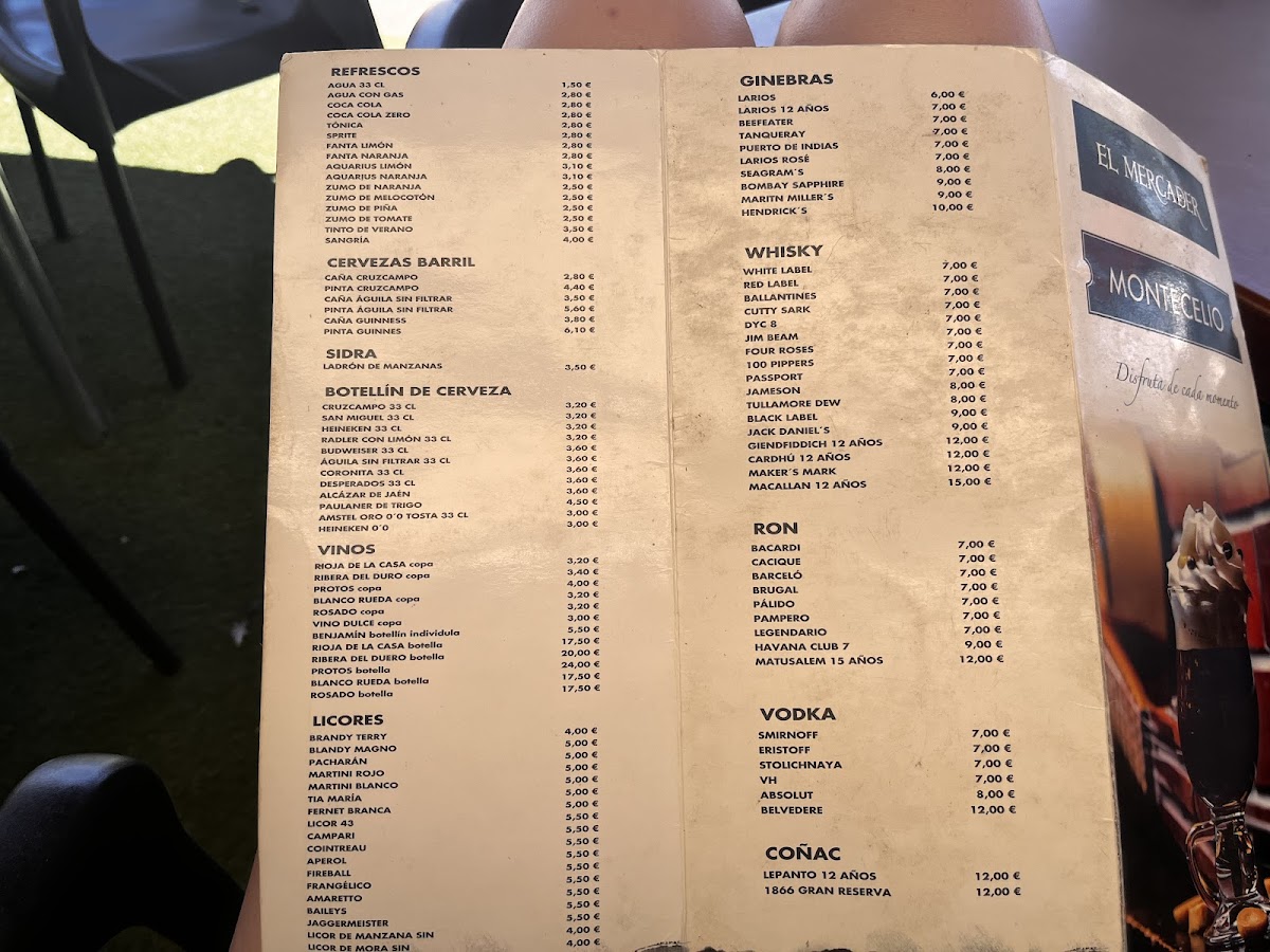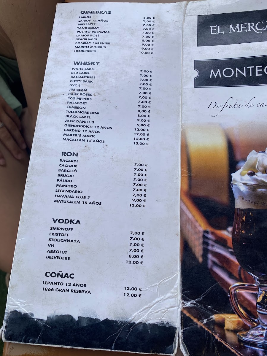 The menu offers a variety of options spanning several categories suitable for different times of the day and dining preferences. Guests can find a selection of cocktails, including classic choices like Piña Colada and Espresso Martini, alongside a range of beers and wines such as white wine and rosé. The food menu primarily features tapas and light bites, including traditional items like ensaladilla rusa, champignon, meatballs, and olives. These selections are complemented by accompanying baskets of bread, aligning with typical Spanish tapas service.